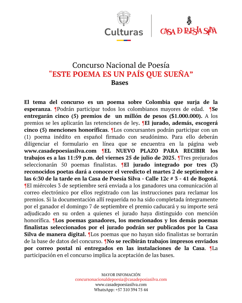 BOGOTÁ, D.C., 15 de julio de 2025 – La Casa de Poesía Silva anuncia la ampliación del plazo de la convocatoria para su Concurso Nacional de Poesía «Este poema es un país que sueña». Los poetas colombianos interesados en participar tendrán ahora hasta el viernes 25 de julio de 2025 a las 11:59 p.m. para enviar sus obras.