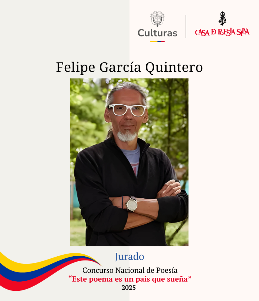 Felipe García Quintero: Nacido en Bolívar, Cauca, es docente titular en la Universidad del Cauca y una de las voces poéticas más consolidadas de su generación. Ha publicado una extensa obra que incluye títulos como La herida del comienzo (2005) y Animal de ayer (2018). Su trabajo ha sido reunido en la antología La piedad. Poesía reunida 1994-2013 y recientemente fue galardonado con el III Premio Iberoamericano de Poesía José Santos Chocano.