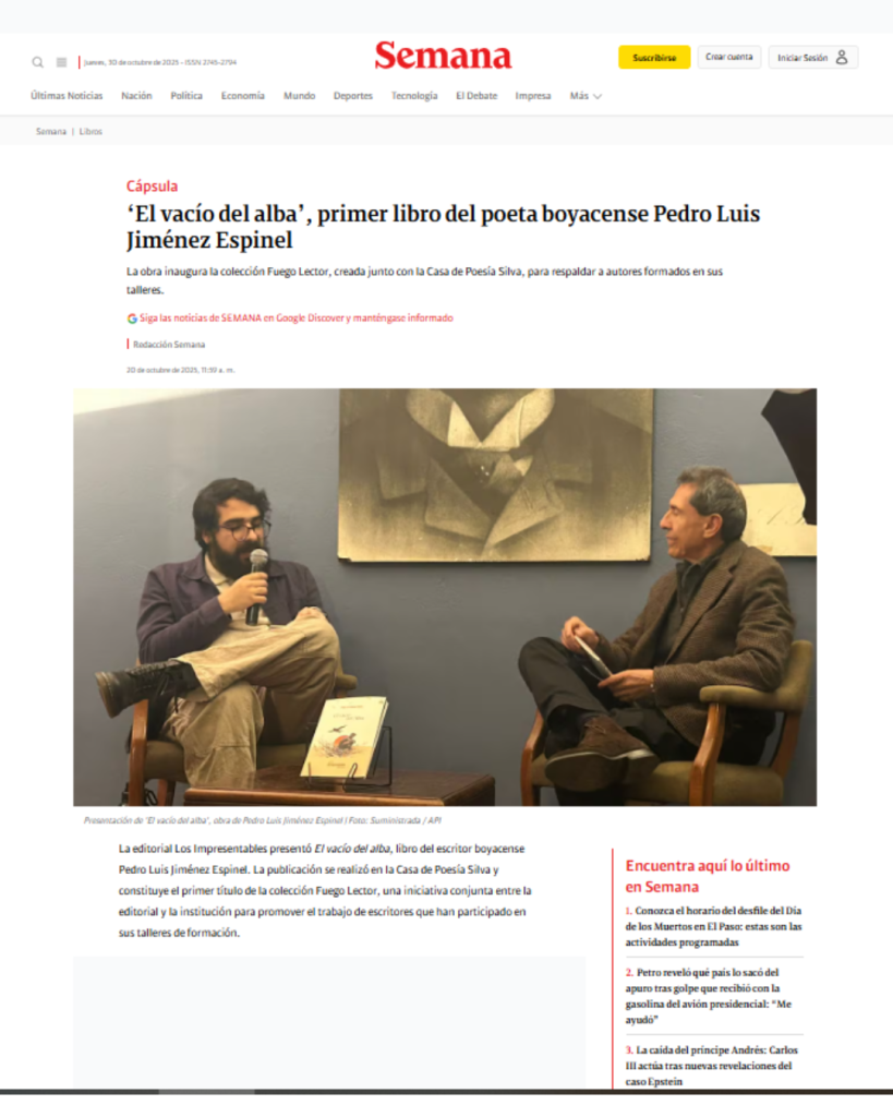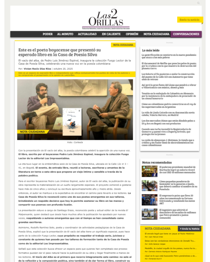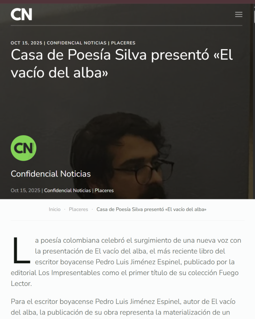 La aparición de «El vacío del alba» sigue generando comentarios positivos en diversos medios, lo cual reafirma la calidad del libro y la pertinencia de la colección. Les invitamos a consultar la cobertura mediática: